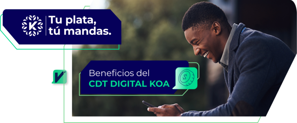 En KOA creemos que invertir no debe ser exclusivo de unos pocos. Con este CDT queremos que más colombianos encuentren alternativas sencillas, rentables y confiables para hacer crecer sus ahorros. Este producto es 100% digital, está protegido por el Seguro de Depósitos de Fogafín.