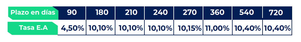 ¿Prefieres otro plazo?. Accede a la tasa que más te convenga en términos de 90 a 720 días y mantén ese beneficio hasta la fecha de apertura. Cupo limitado. Aplican TyC.